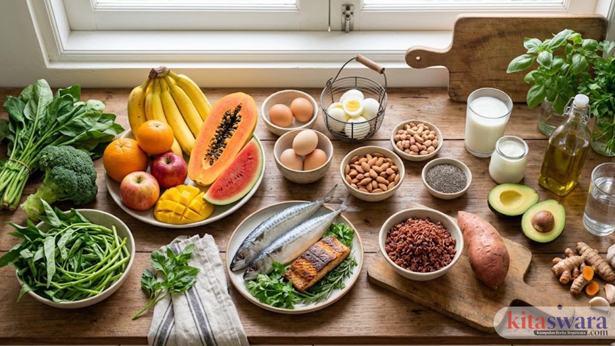 Sayuran, buah, protein seperti telur dan ikan, karbohidrat kompleks, serta lemak sehat.